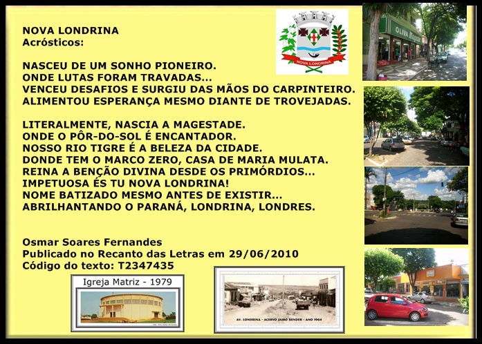 Nova Londrina, Estado do Paraná, situado no Noroeste paranaense, nasceu do sonho mágico de seus cinco fundadores, teve seu nome batizado mesmo antes de existir, de ser fundada. Seus fundadores pioneiros foram visionários, entusiasmados, otimistas, vencedores. Transformaram um projeto, num berço querido, chamado Nova Londrina - Rainha do Noroeste Paranaense... Pioneiros, gente do Brasil e do Mundo que para cá vieram e seus filhos natos dão continuidade ao sonho que virou realidade.